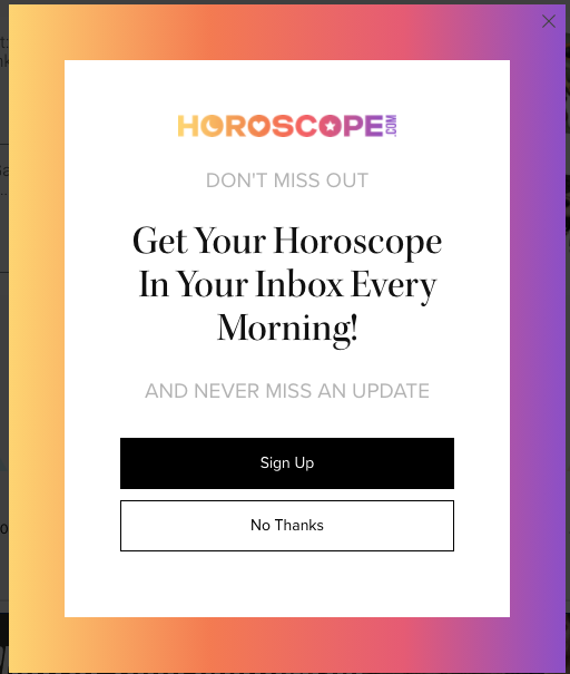 The colour palette is interesting. The use of the warm toned sunset colours in a gradient may be replicating the sunset before the night sky when constellations are read. This could perhaps be showing that the users horoscope is about to be revealed like the night sky after a sunset. The gradient is also a very modern design choice. Ombre’s and gradients have become popular within the past few years – this may suggest the website is attempting to appeal to a more millennial audience.