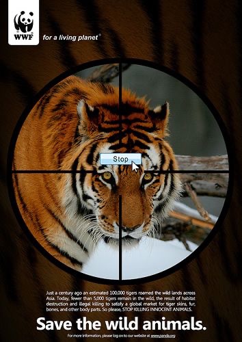 This poster is definitely thought provoking, distressing and probably aimed at a younger or more millennial audience because of the computer reference. This poster really emphasises the impact that you as the viewer have. The point of view is as if you are looking down the barrel of a gun about to hunt the tiger, yet you also have the power to easily stop it. The wwf have an online shop where you can donate money to the organisation which is perhaps what the computer style ‘stop’ pop up relates to, it encourages the user to make a difference and shows it as easy as pressing a button.