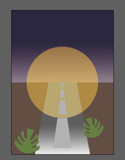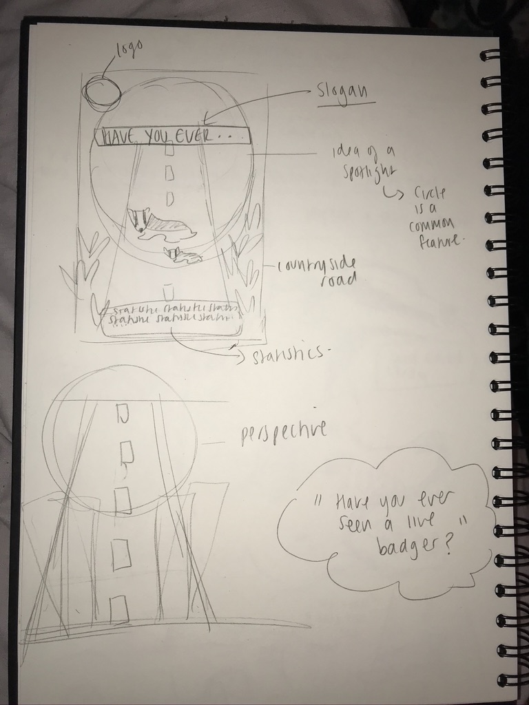 I wanted to include a baby badger for emotive purposes which is a key element in any poster to raise awareness. I then experimented with the background to my poster and colour palettes. I wanted to incorporate the common feature of a circular shape into my poster – like a spotlight on the badger. I also used a gradient to create the effect of a dark night sky and add more perspective on to the road.