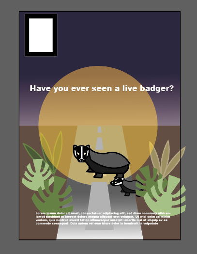 After I had added the plants I added the two badgers and the rest of the plants and adjusted them as I wanted. I then proceeded to add the typographical elements of my poster in which I used the font ‘Arial Black’ which is a bold but clear and easy to read font similar to the inspiration I found for my poster. I was also going to try and incorporate some statistics and a logo on to my poster.
