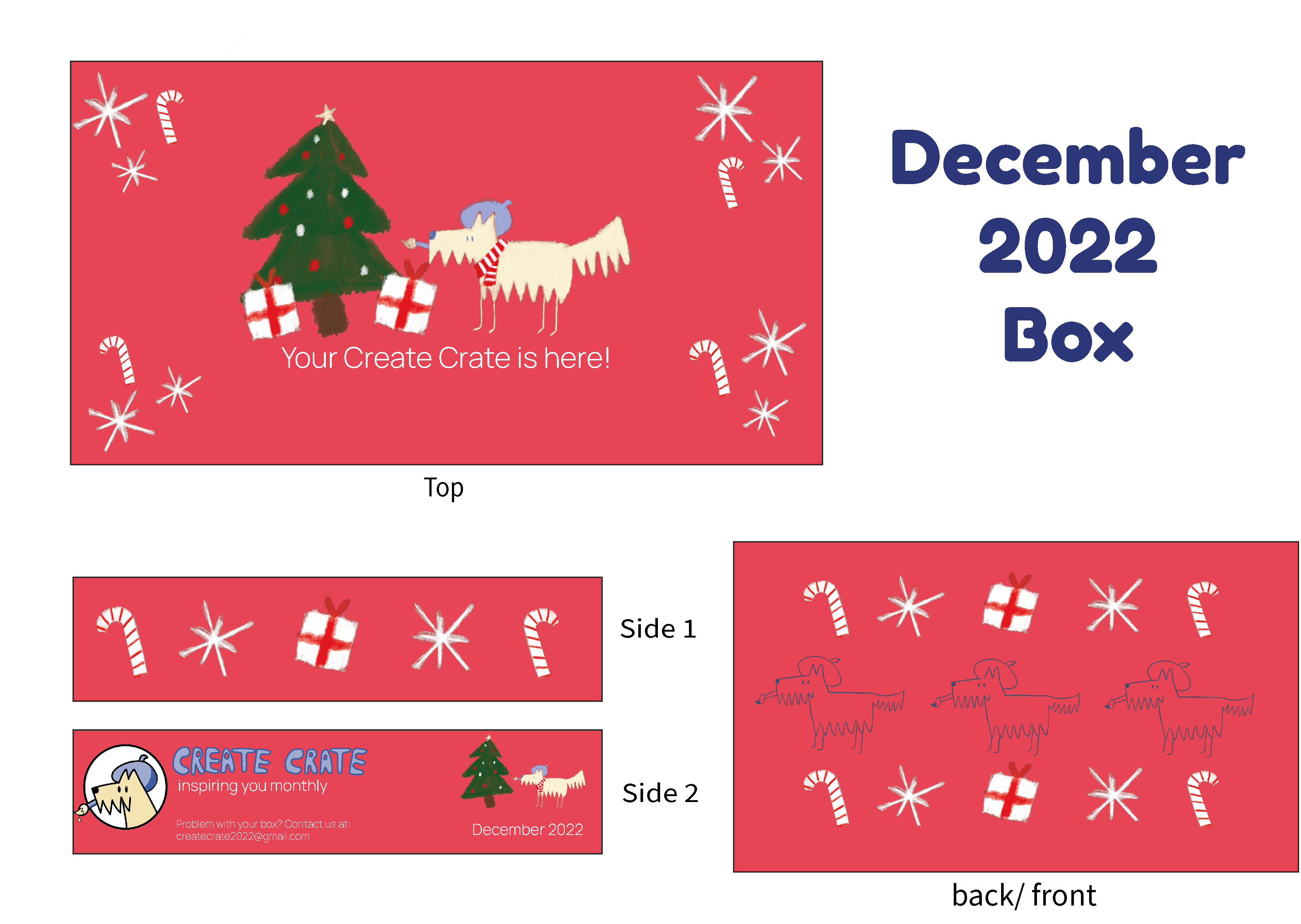 The Create Crate Christmas edition 2022! Full of festive fun and treats. You may find, wooden shapes, paint pens, glitter … and much more!