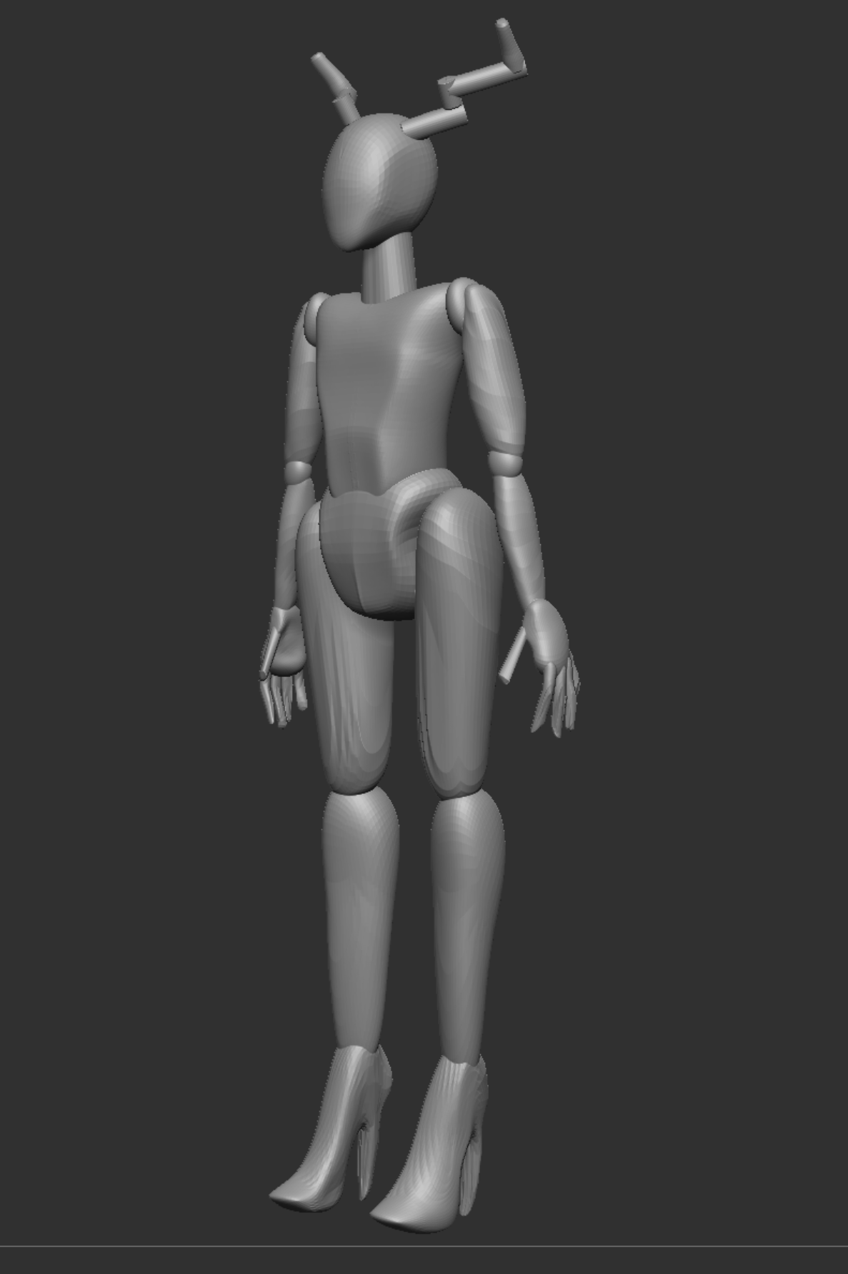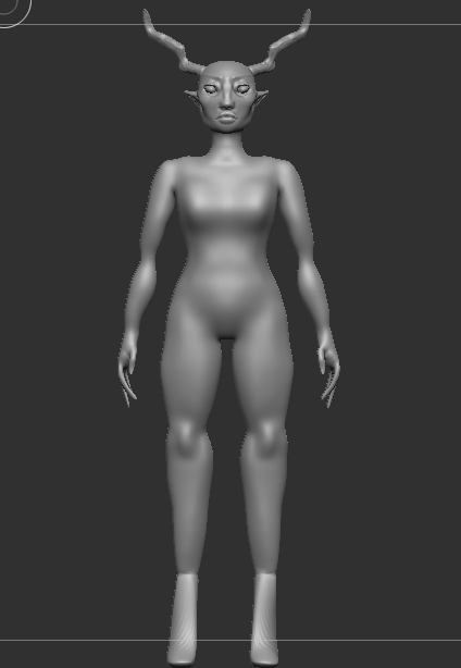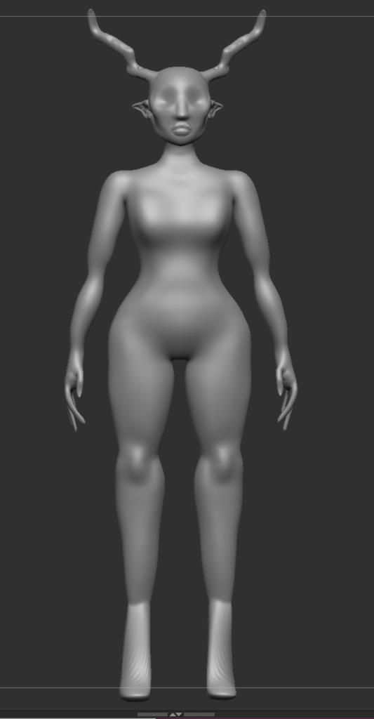 After we were happy with the way our anatomy looked, we Zremeshed our model and divided it’s subdivisions so that we could work on the anatomy as a whole model and not a sum of parts. I decided to mould the shoes onto my character as I thought that it would be the easiest way to create the high heel shape. I then used the ‘clay build-up’ brush on a mix of Zadd and Zsub to create the indentations and add the lips on to the face. The hands were created by using the ‘move’ brush to extend clay that was built up on to the hands, I chose to do this because I wanted her fingers to be long and extended, to give her a scary/ethereal look.