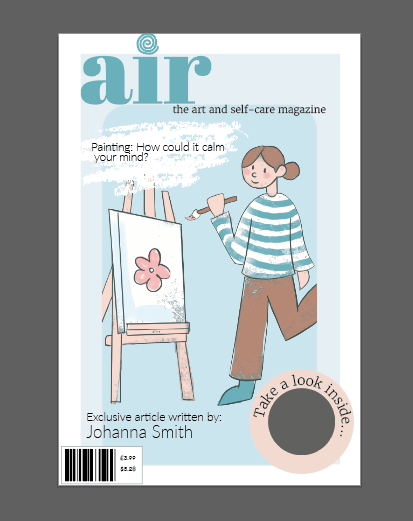 ‘Air’ is a magazine that teaches others how to use art as a form of self care. It is aimed at young adults and teenagers struggling with mental health issues. In my project, colour plays an important role. I have chosen to stick to a set colour palette for my magazine as “brand colours are powerful in helping customers decide whether or not they want to engage.” (Marshall, 2021). My colour palette consists of light tones of blue, peach and brown. I chose these light colours as they are comforting and not intimidating. I also chose to use light blue heavily as it can be linked with the element of air.