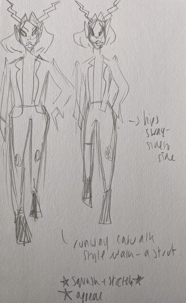 The first animation I wanted to create was a basic walk cycle to ease me in to the animation process. Estry (my characters name) would definitely walk with attitude and confidence so for this I decided to look into fashion catwalks as inspiration. Specifically the exaggerated style of drag runway walks. I found a compilation of catwalks from one of my favourite drag queens and studied the way that the body moves when exageratting a walk.