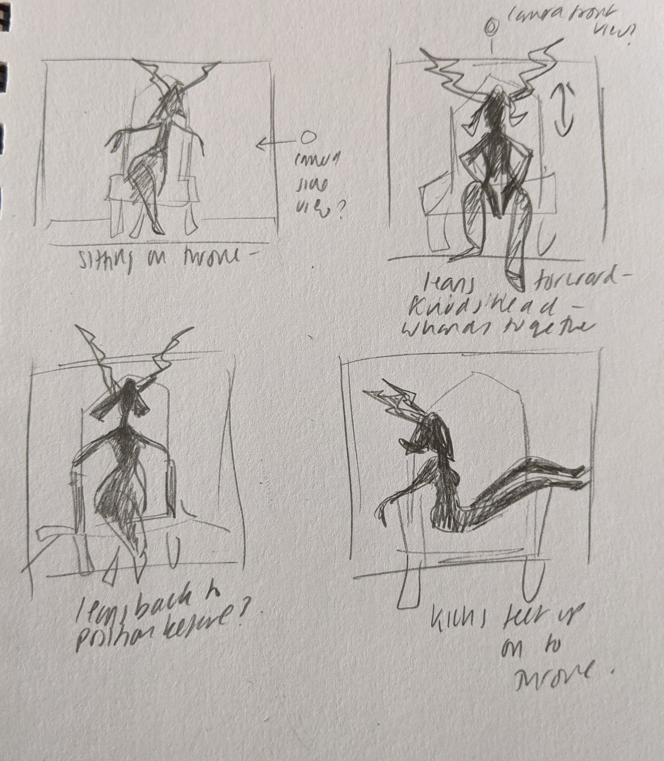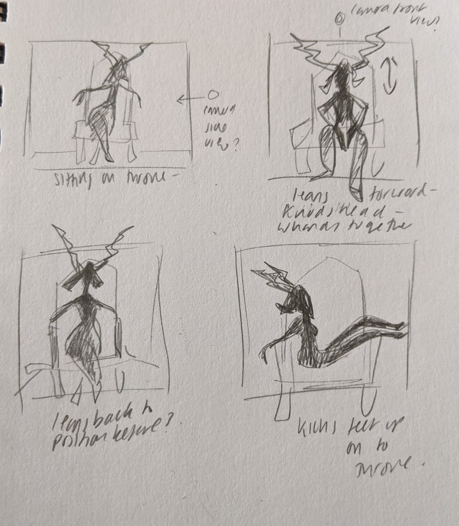 For my second animation I wanted to start it with Estry sitting on her throne, shooing someone away and then ending the animation in a dramatic position in which she is lounged over her throne to show her disinterest. I wanted her poses to be very dramatic and exaggerated so the first thing I thought of was dance. I studied this scene from ‘Flashdance’ to get an idea of how the body would be posed in a position such as this. I then storyboarded each position that I wanted to keyframe in order to create the animation.
