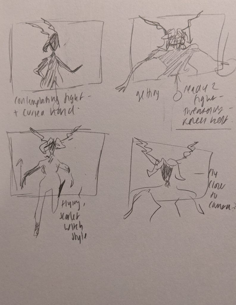 For my third animation I chose to create an idle/flying sequence. I wanted to loosely base this off of ‘Scarlet Witch’ from the marvel series as she floats in the air when fighting and I feel like she is very similar to my character. I storyboarded possible poses for this animation.