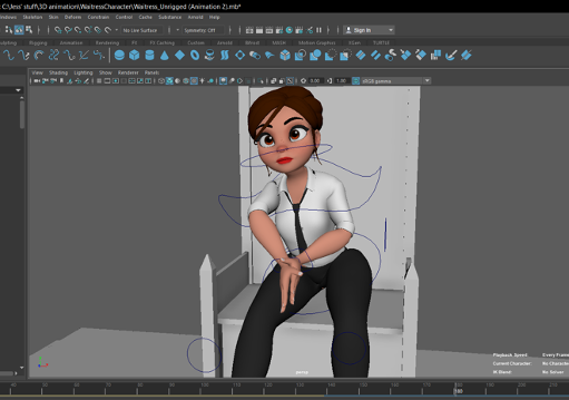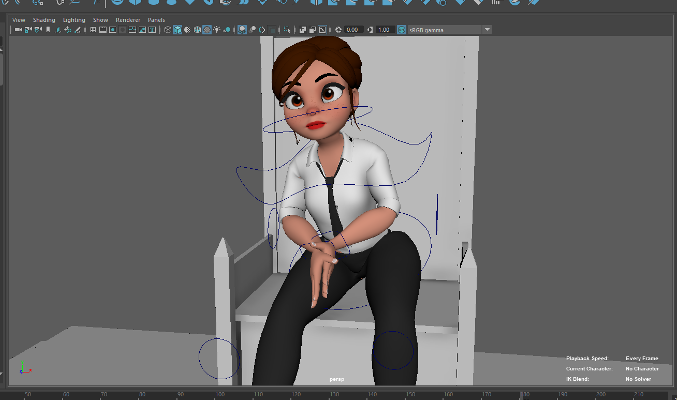 In my second animation I created a throne scene. Firstly, I set up a very simple scene with a throne and a few steps. In this animation I used the pose to pose animation principle in which I had a few key poses that I knew I wanted her to be in and the rest of the frames would be her getting into the next position. I encountered a few issues with this animation. Originally I had not created elbow controls but realised when making this animation that she needed to have them in order to be in the correct position without the rig breaking.