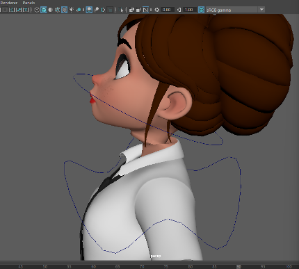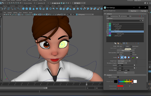 I started with the head, including the eyes. I would change the values to one by using the select tool on the weight painting menu to select vertices and ‘flood’ them. When the head was finished painting, I tested it by rotating the head. Unfortunately I experienced some stretching, when this happened I would adjust the painting by using the smooth tool and the paint tool. This process was all trial and error.