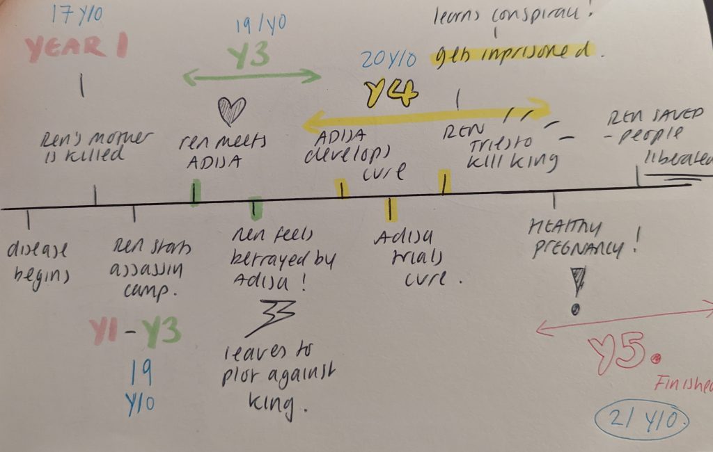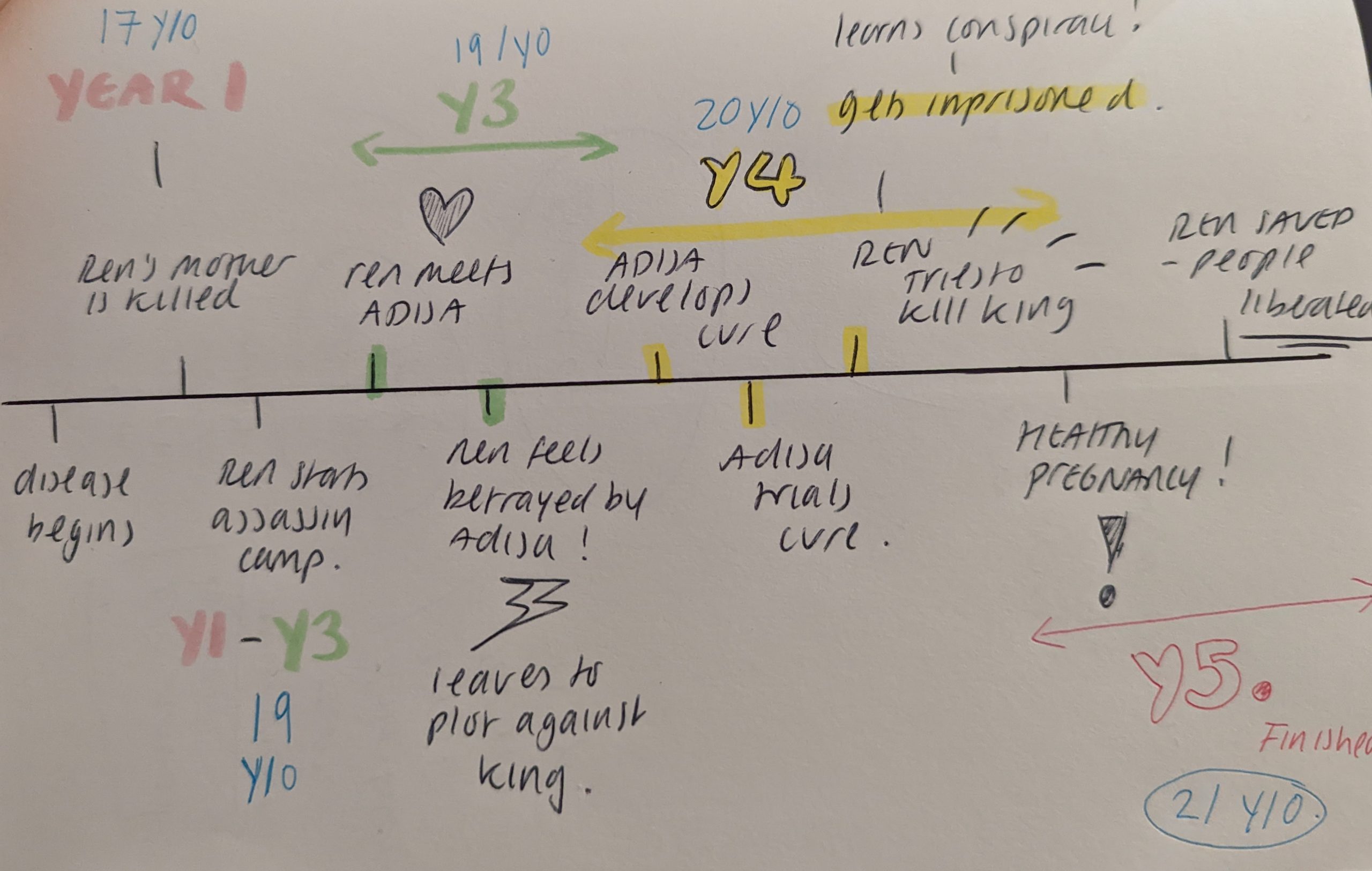 Creating the timeline helped me to figure out how many years the story will play over, and what the key elements from each year will be. It also helped me to figure out the ages of characters and how they would develop over the duration of the story.