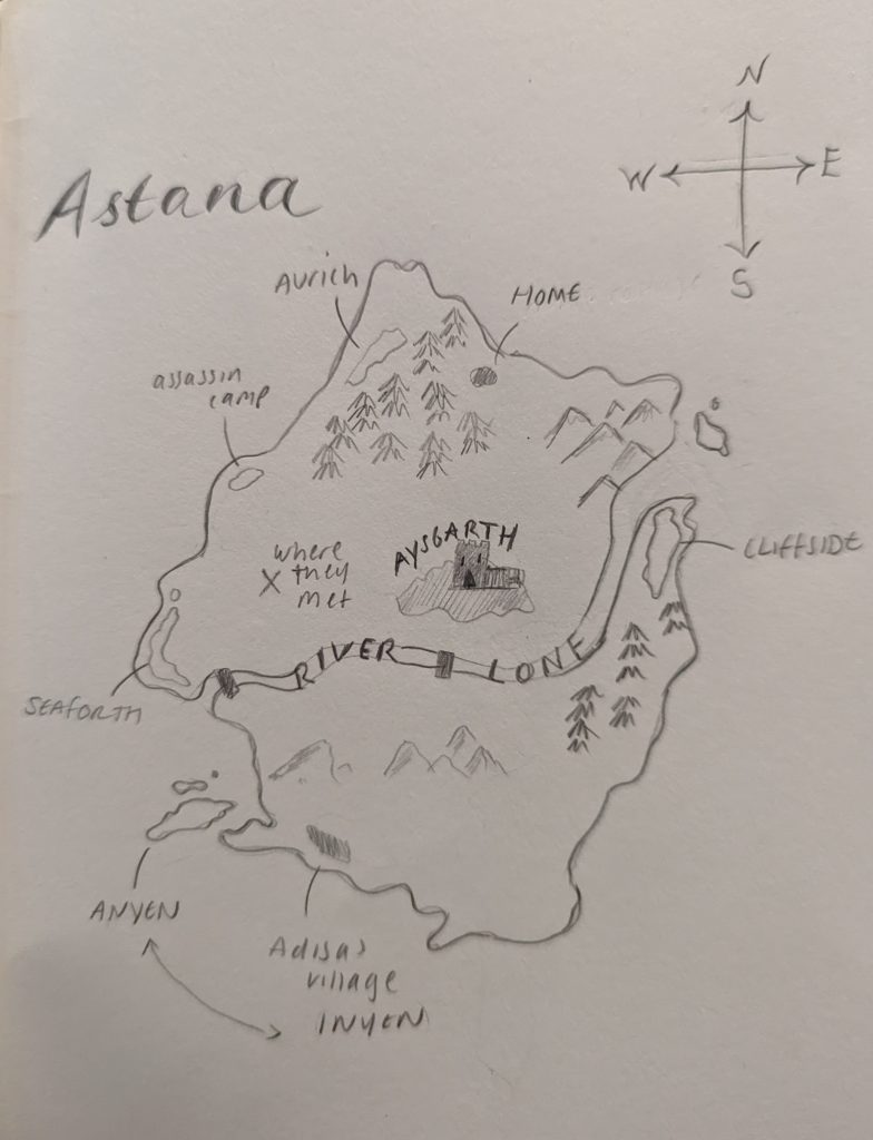 Location: My story is based on a small fictional fantasy island named Astana. Astana is a split into two islands by the ‘River Lone’. The main city is called ‘Aysgarth’ and is placed in the centre of the island. The northern section of Astana is cold and has a similar landscape to Scotland but the south side is a lot warmer.