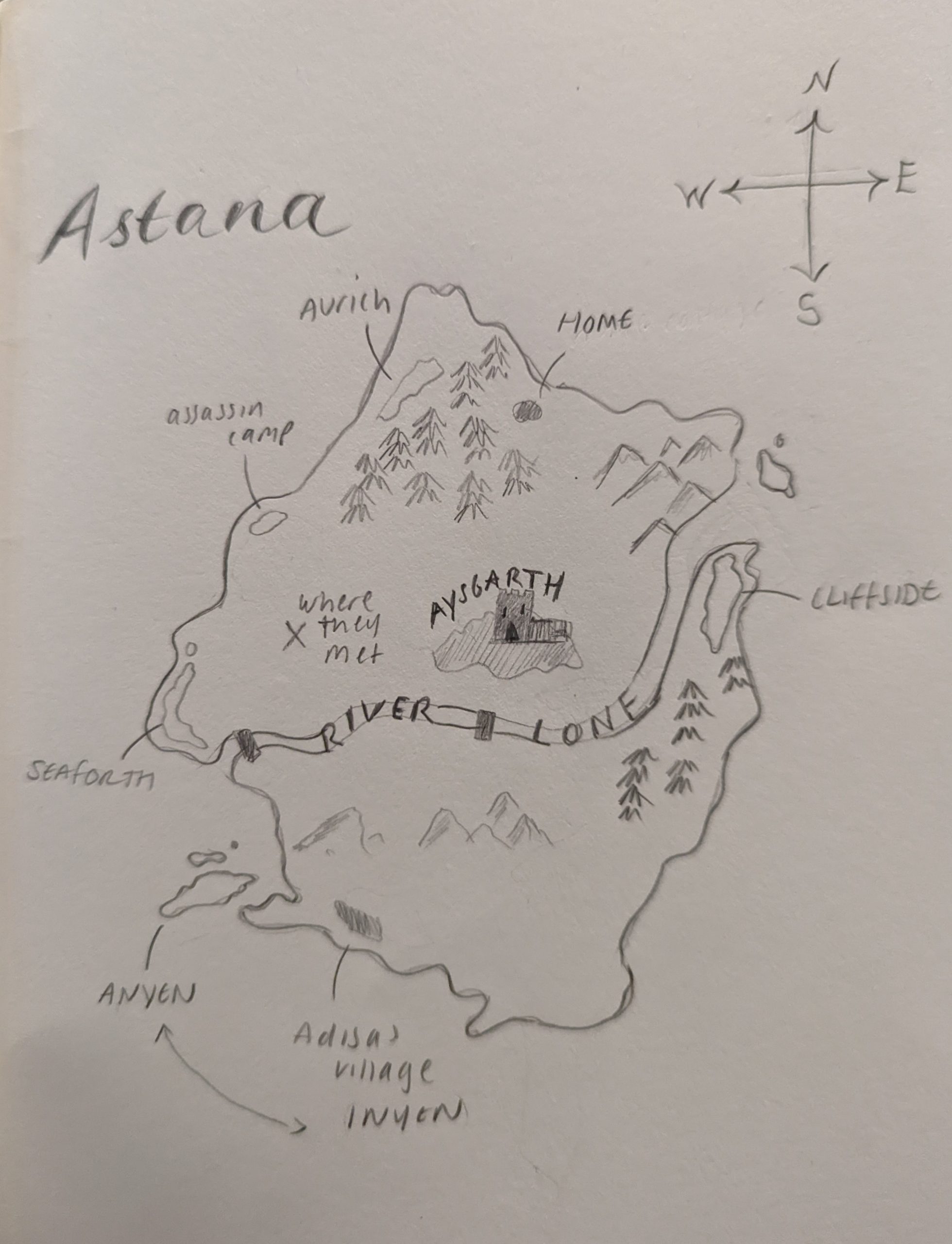When deciding what the map was going to look like, I had to decide on what the actual island landscape would look like itself. Astana is a very natural island covered in forests and mountains. It is also split by a giant river running all the way through it. I designed it like this to show the divide between Ren’s home and Adisa’s home, to show how far apart their worlds are and how they meet perfectly halfway, which is symbolic of their personal relationship. I imagine Astana to be a very similar setting to somewhere in Europe, such as Scotland, Ireland or the Nordic countries. I believe I will be able to create this effect with my art when I start to draw up backgrounds and scenery.