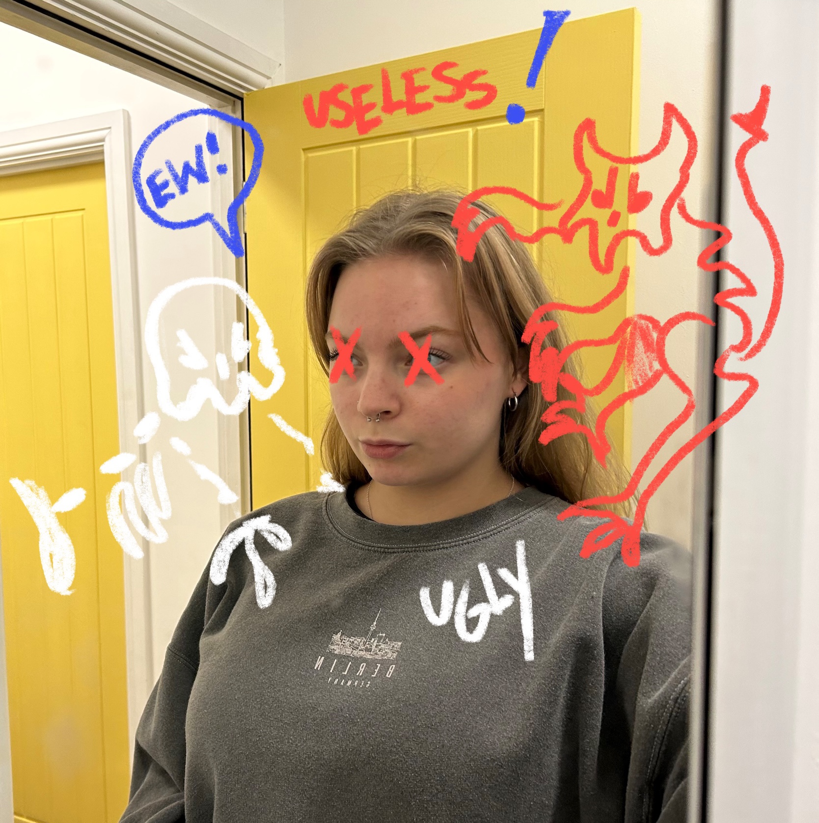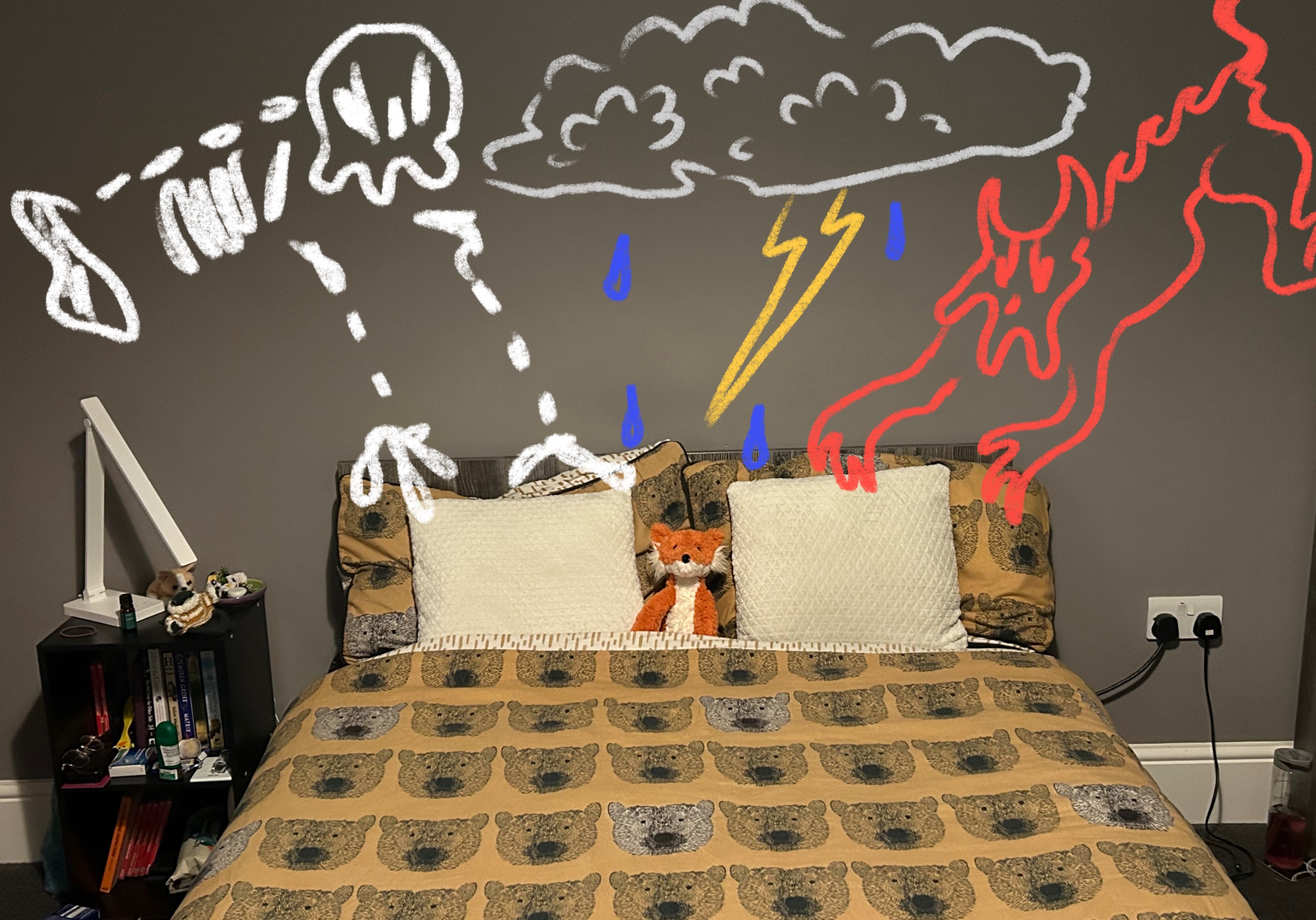 The first thing I experimented with was the style of the advert. I edited photos that resemble camera shots in my storyboard to see how I wanted the final product to look. I did this by importing photos into Procreate and drawing on top of them. I was really happy with how the final images ended up looking, they were intense enough to send a message but not scary enough to be inappropriate for an advert designed for TV. I was also extremely happy with the style of illustrations and how they looked on top of images from real life.
