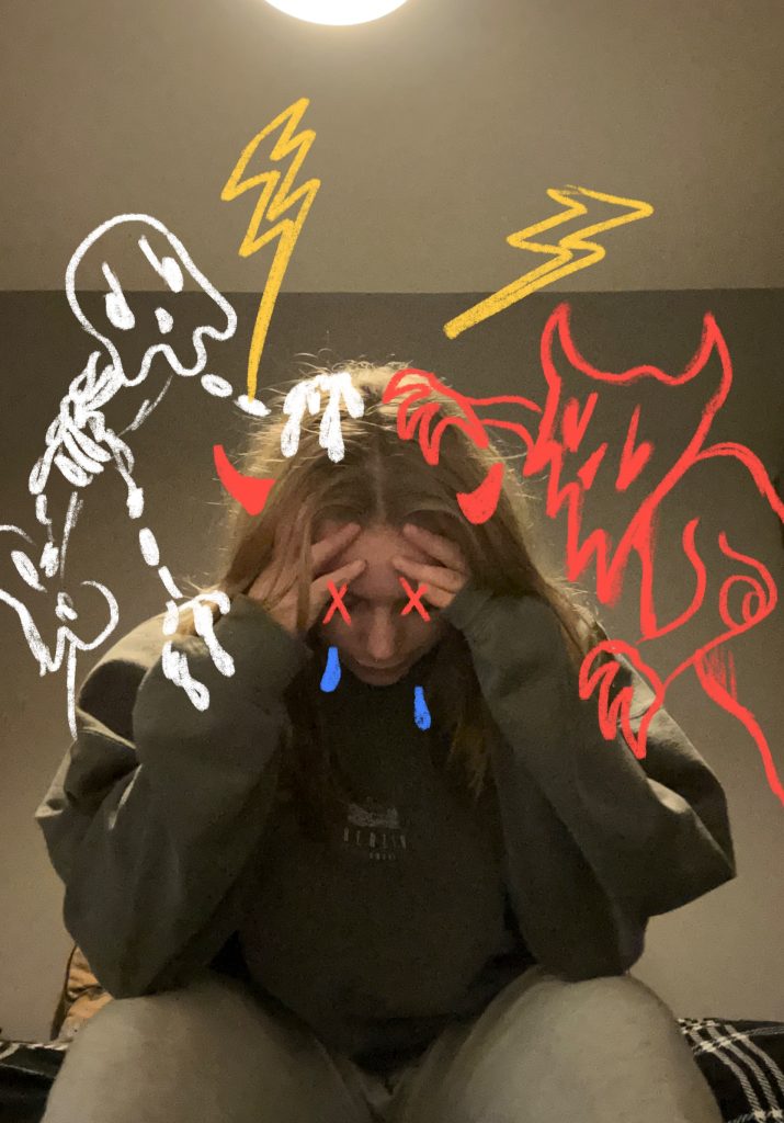 In the style experiments I made a few artistic decisions such as using certain colours for my creatures. I decided on red for the devilish character as red can be a symbol of “aggression, dominance and strength” (Melling, 2019) I thought this would be a good metaphor for how anxiety can feel dominant and aggressive in our lives. The other skeletal character is white as this could be seen as “stark, cold and isolated” (Cherry, 2022) again resembling how OCD and anxiety can convince you that you are alone.